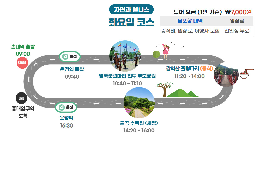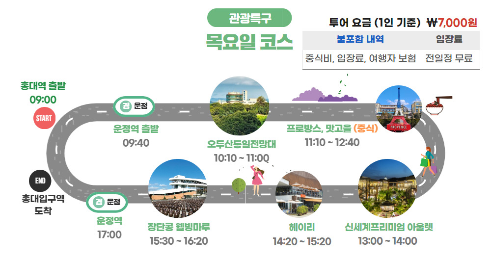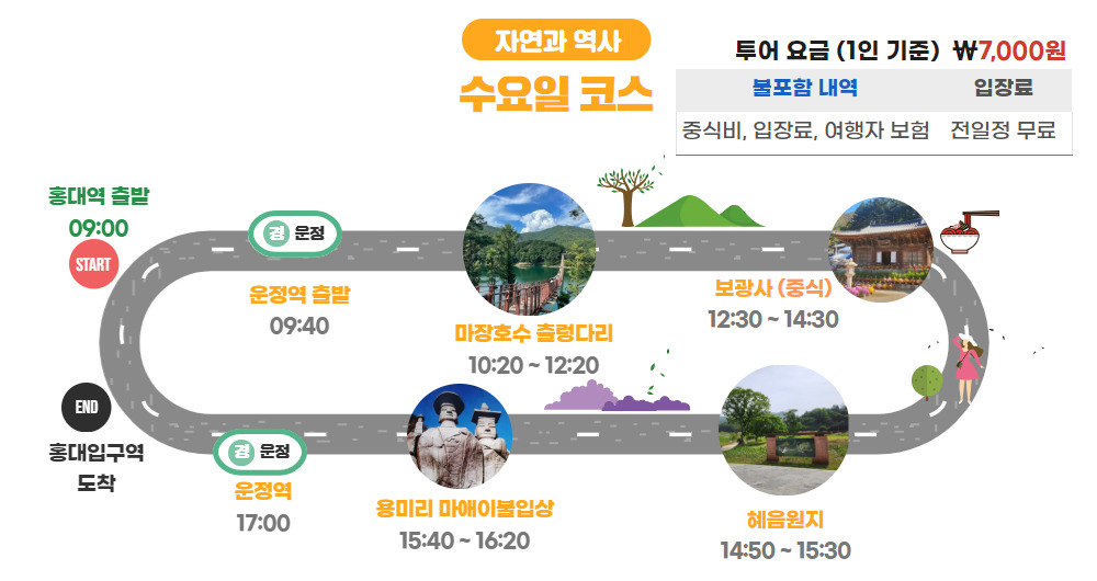 - 정기 코스: 저렴한 7,000원에 다양한 명소 탐방.